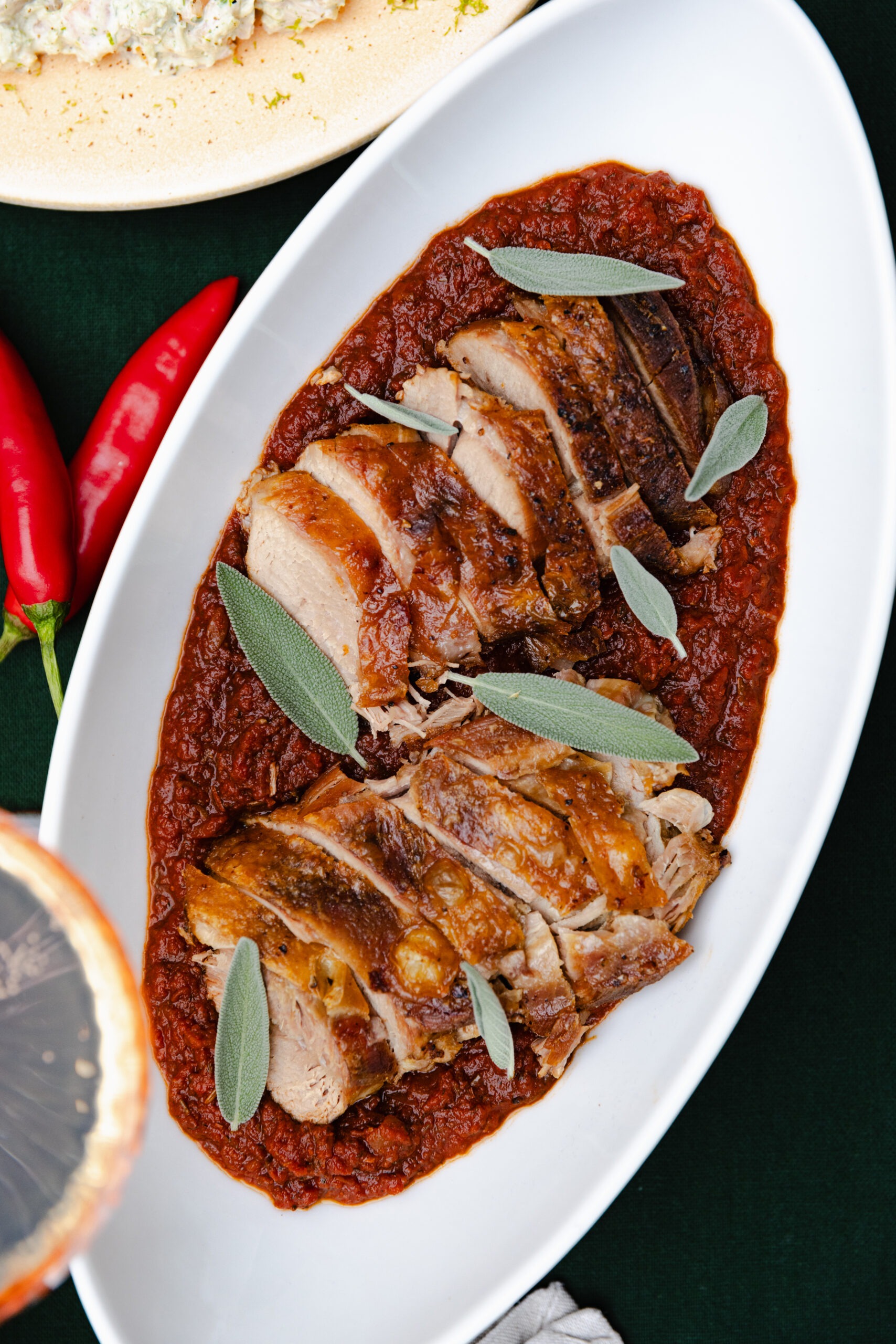 – Tomatbraiseret kalkun cuvette i tomatsauce, paprika & salvie