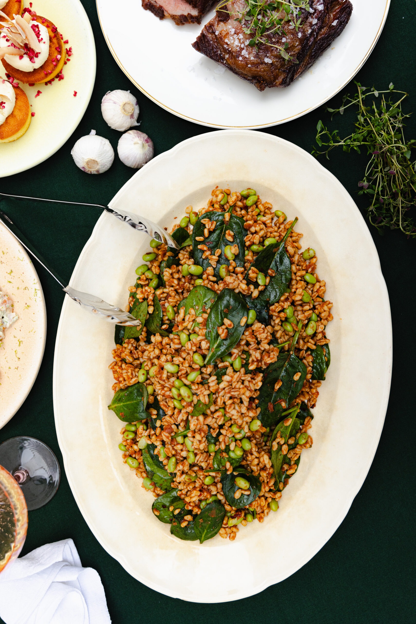 – Hvedekernesalat m. pesto af soltørret tomat, mild chili-hvidløg & edamame bønner