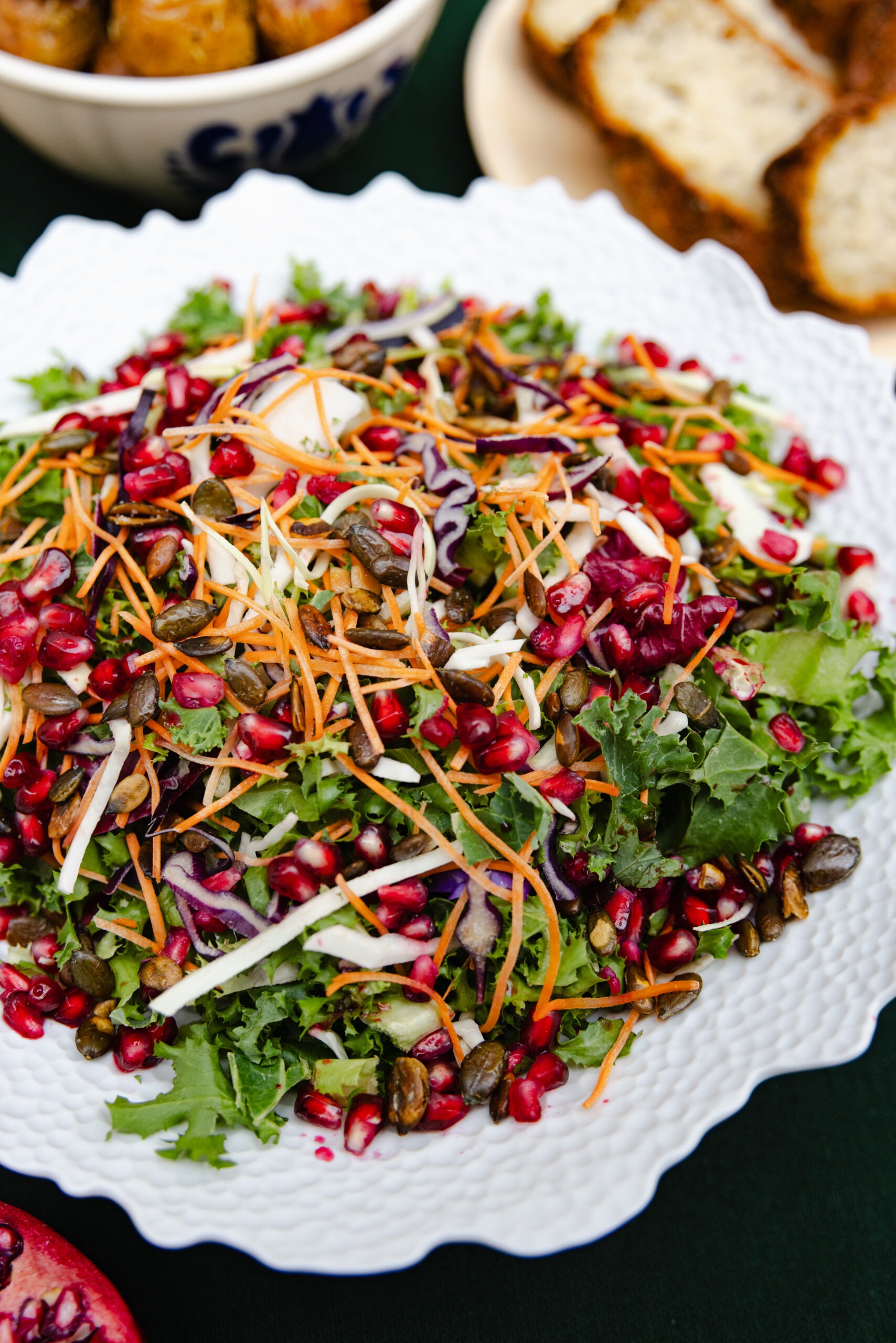 – Sprød salat med årstidens grønt, granatæbler, vinaigrette & ristede kerner