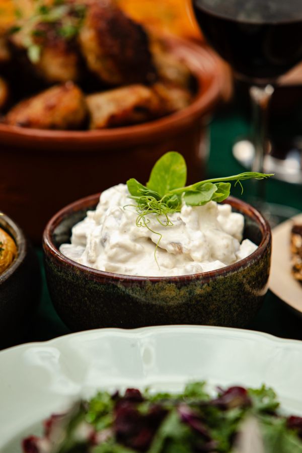Cremet hønsesalat m. syltede hvide asparges & ærteskud