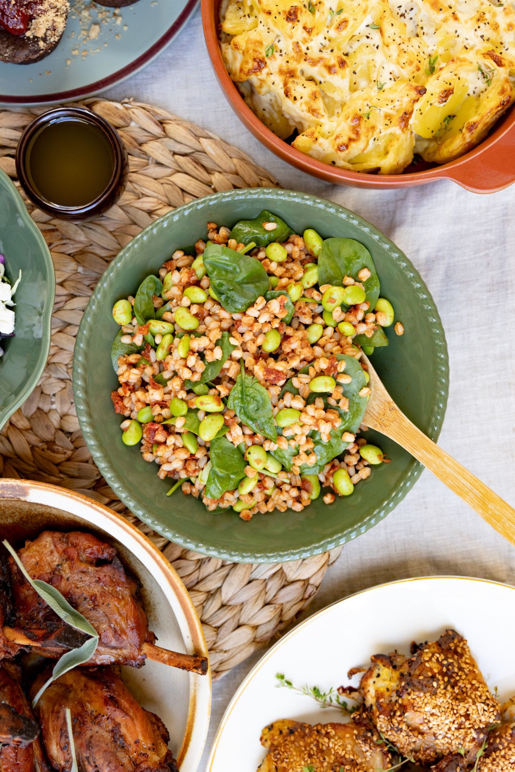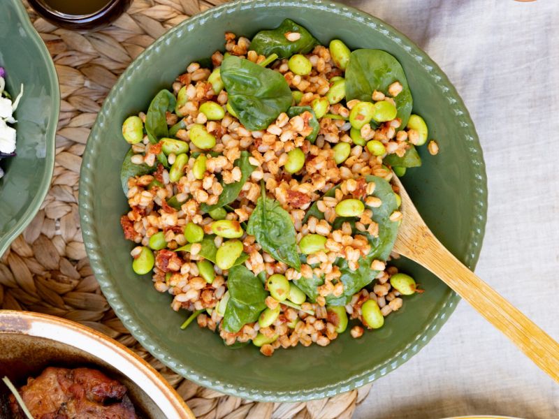 – Hvedekernesalat m. pesto af soltørret tomat, mild chili-hvidløg & edamame bønner