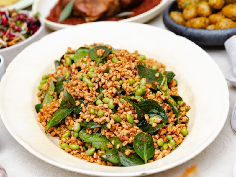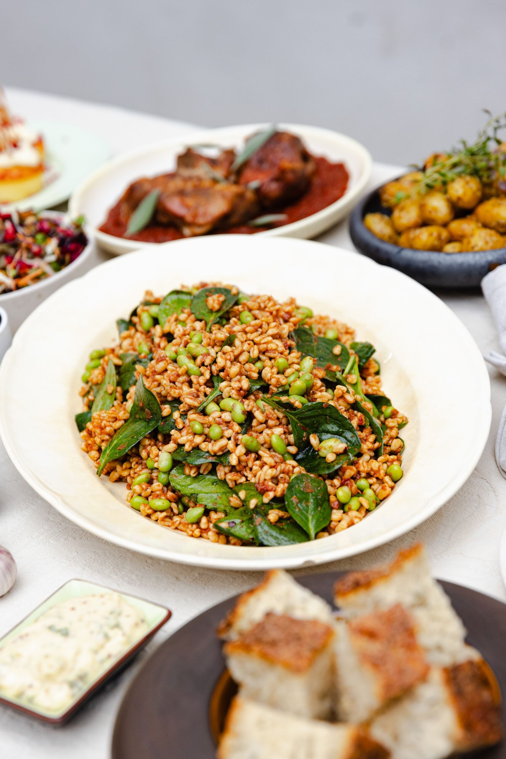 – Hvedekernesalat m. tomater, bønner & spinat i sherry vinaigrette