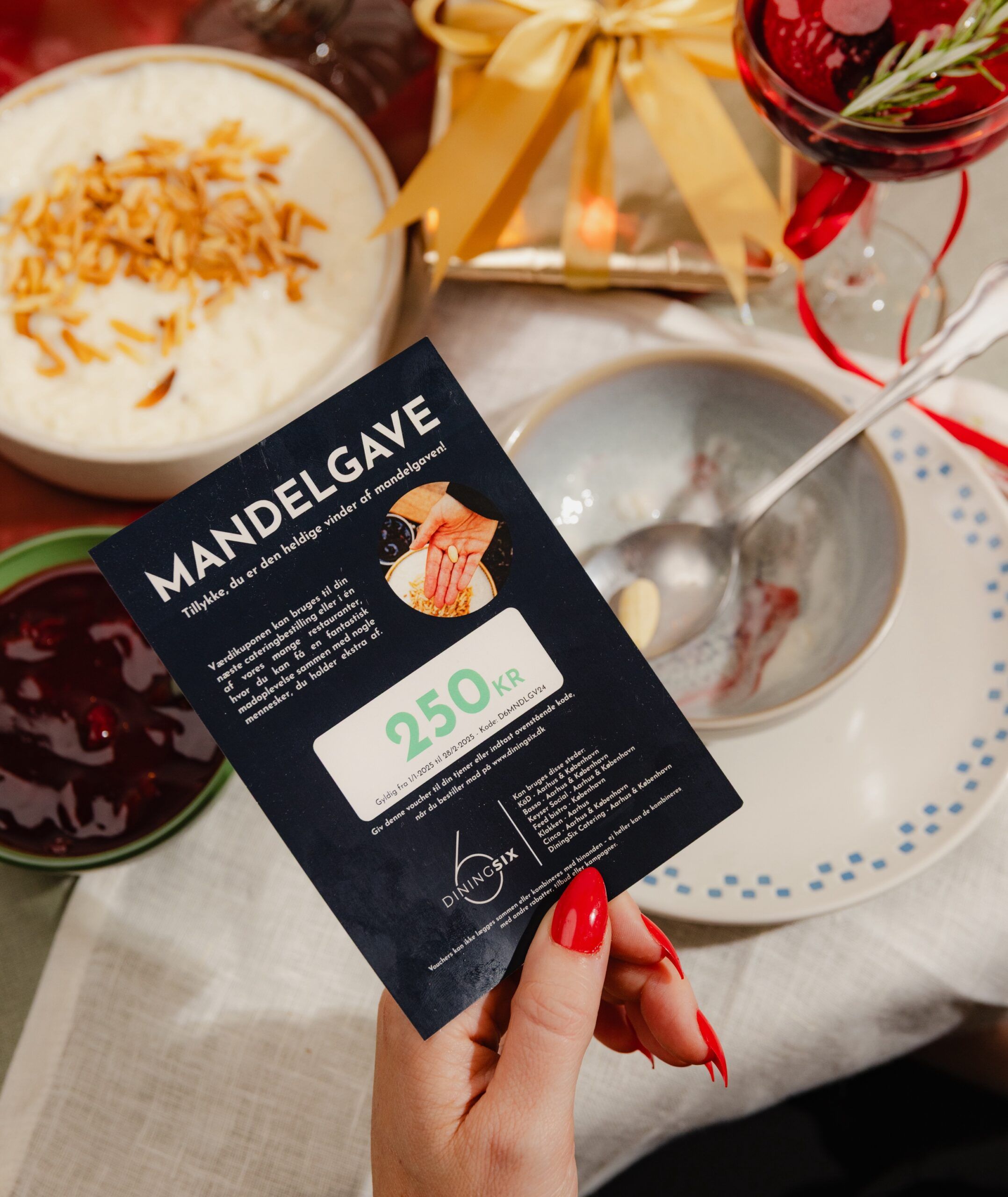 Mandelgaven er i år en voucher på 250 kr., der kan bruges på din næste cateringbestilling eller på en valgfri DiningSix-restaurant: