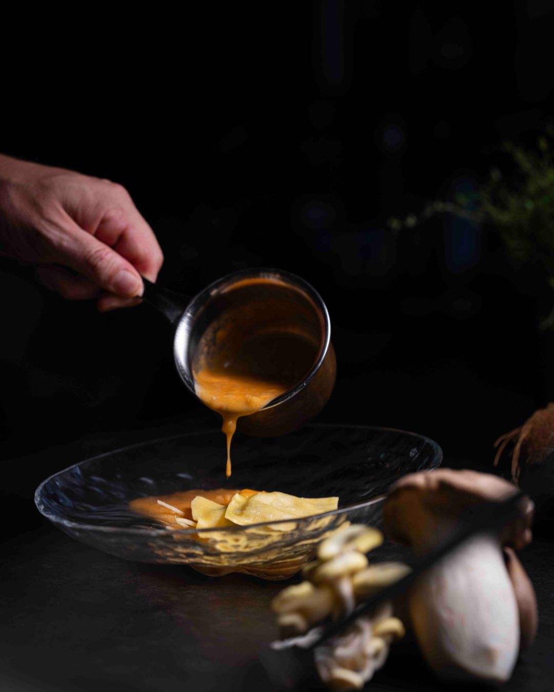 Hummerbisque med asiatiske smage af citrongræs, kokos & ingefær. Serveres med julienne af suppeurter og håndlavede, fyldte pastamedaljoner med italienske Karl Johan svampe, cremet ricotta & frisk persille. Toppet med grøn kaffir-limeolie.