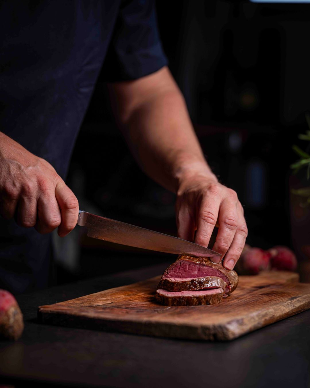Rosastegt oksemørbrad med kartoffelgratin smagt til med gruyèreost, timian & løg. Serveres med sprød vintersalat, yuzu-vinaigrette, solbærglaserede rødbeder & reduceret portvinsglace med trøffel.