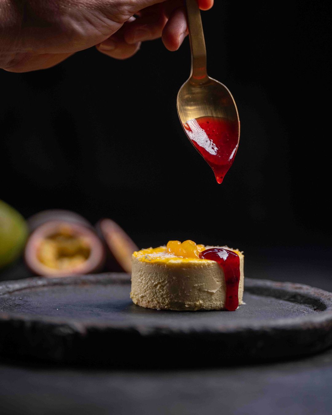 Cremet mangomousse med et blødende hjerte af passionsfrugt på en kokoskiksebund. Serveres med syrlig hindbærcoulis, crumble på Oreos & frysetørret hindbær.