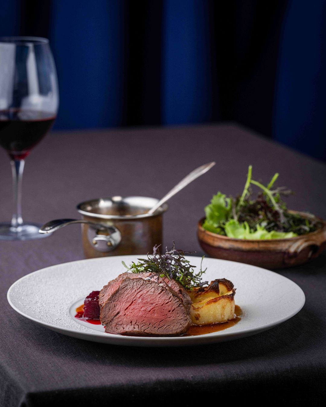 Rosastegt oksemørbrad med kartoffelgratin smagt til med gruyèreost, timian & løg. Serveres med sprød vintersalat, yuzu-vinaigrette, solbærglaserede rødbeder & reduceret portvinsglace med trøffel.