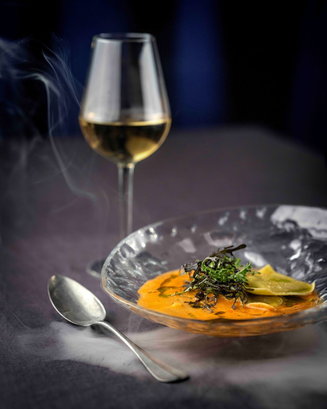 Hummerbisque med asiatiske smage af citrongræs, kokos & ingefær. Serveres med julienne af suppeurter og håndlavede, fyldte pastamedaljoner med italienske Karl Johan svampe, cremet ricotta & frisk persille. Toppet med grøn kaffir-limeolie.