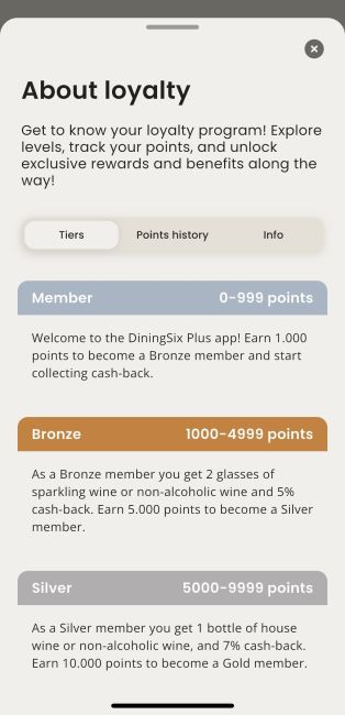 Næste gang du nyder en middag hos os og det er tid til at betale regningen skanner jeres tjener blot dit loyaltites kort i appen så du optjener loyalitets point og opspare cash-back til din DiningSix+ wallet. En krone på din regning er et loyaltitspoint hos DiningSix som går direkte mod flere fordele til dig som vores gæst.